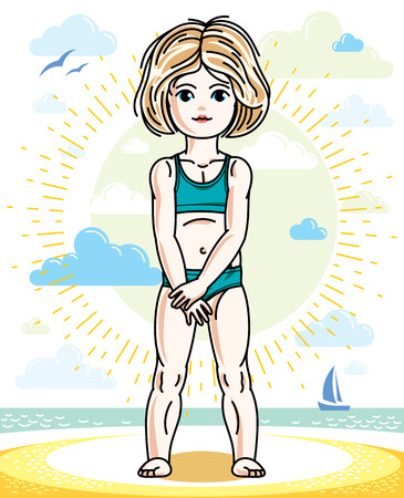 小さなブロンドの女の子のかわいい子供をビキニでビーチに立っていますベクトルの魅力的な子供のイラスト夏の休暇のテーマ 1人のベクターアート素材や画像を多数ご用意 Istock
